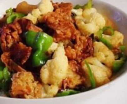 5.炒至菜花已熟,放炸茄丁和360百科青椒翻炒片刻,加味精即可出锅。