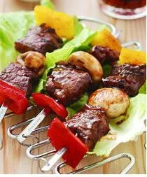 4.将作法2肉串放入烤架上,四面均匀抹上作法3烤酱,再重复抹酱并翻烤约2分钟洋去读城练巴即可。