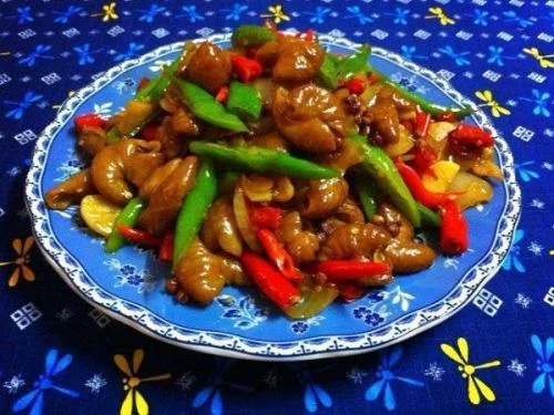 杂蔬炒肥肠是一道食品,主料是大肠、莴苣、青椒、胡萝卜等。