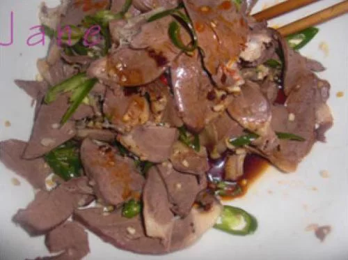 5.猪心切片,加蒜末、青红辣椒、盐干拌均匀。