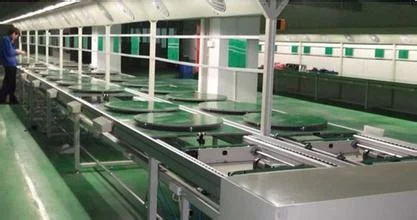 装配流水线线体可分为有顶带照明风扇式装配来自线样与无顶式样组装线两种. 线体每工位均设有气源供应节头.线体的运行速度可根据工人操作的熟练程度进行调节。