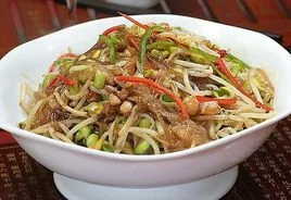 美味豆芽是一道微带辣味的美食,制作材料有绿豆芽、青椒等。