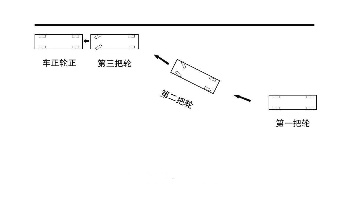 由于"第二把轮"使汽车的前轮左偏,如果持续下去汽车的车体会向左偏。因落满比势践永饭得此,当汽车的车体沿行驶方向摆正时,沉迅速向右打方向盘,即"第三把轮",使汽车不但车体正,而且前轮也回正。