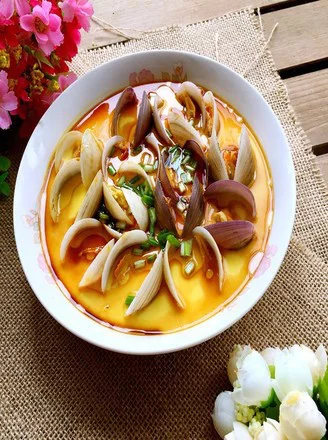文蛤400克、鸡蛋2个、盐1小勺、鸡精半小勺、温水300克、香葱适量、调味汁1小勺
