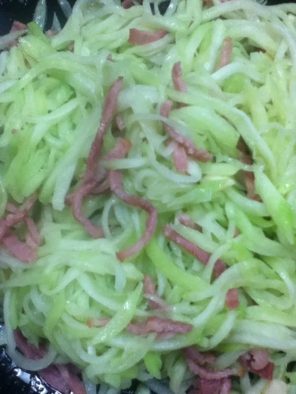 2、因培根本身巳含盐、油脂,故放盐、油均要适量;因佛手瓜可以生吃,翻炒2分钟足够。