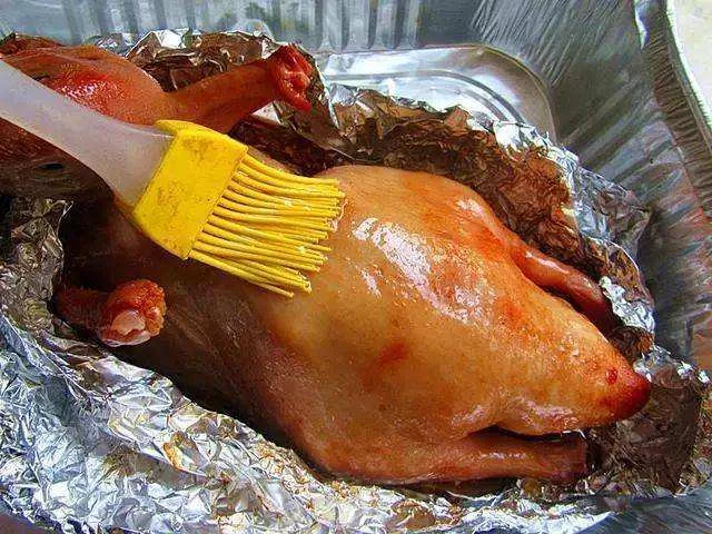 5、用刷子蘸脆皮水均匀的刷遍鸭子全身