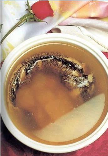 生鱼1条重360百科约1斤(约600克),瘦肉4两(约160克),花旗参片5约(约20克),火腿1两(约40克),上汤5杯,姜1片。