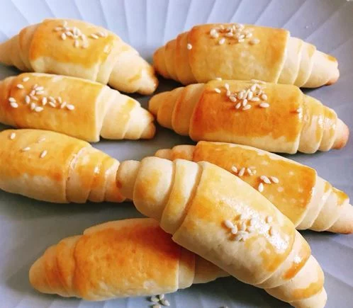 3.松弛完分割好等份,翰成尖三角型,从下而上卷起造型,放入模具。