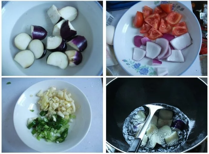 特点: 切好的茄子马上要用清水泡上,以免发黑。
