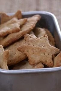 3.用擀面杖将面团擀成薄面皮,用叉子在面皮上叉一些小孔,用饼干模压成自己喜欢的形状。