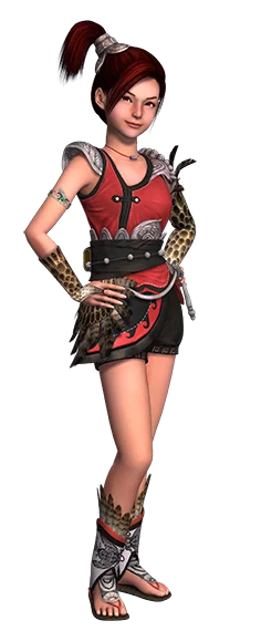 扎着斜马尾辫,服装以红色为主。最大的特点就是左臂戴着由海东青羽毛做成的护臂,护肩也是海东青头部的造型。【第一至六季】