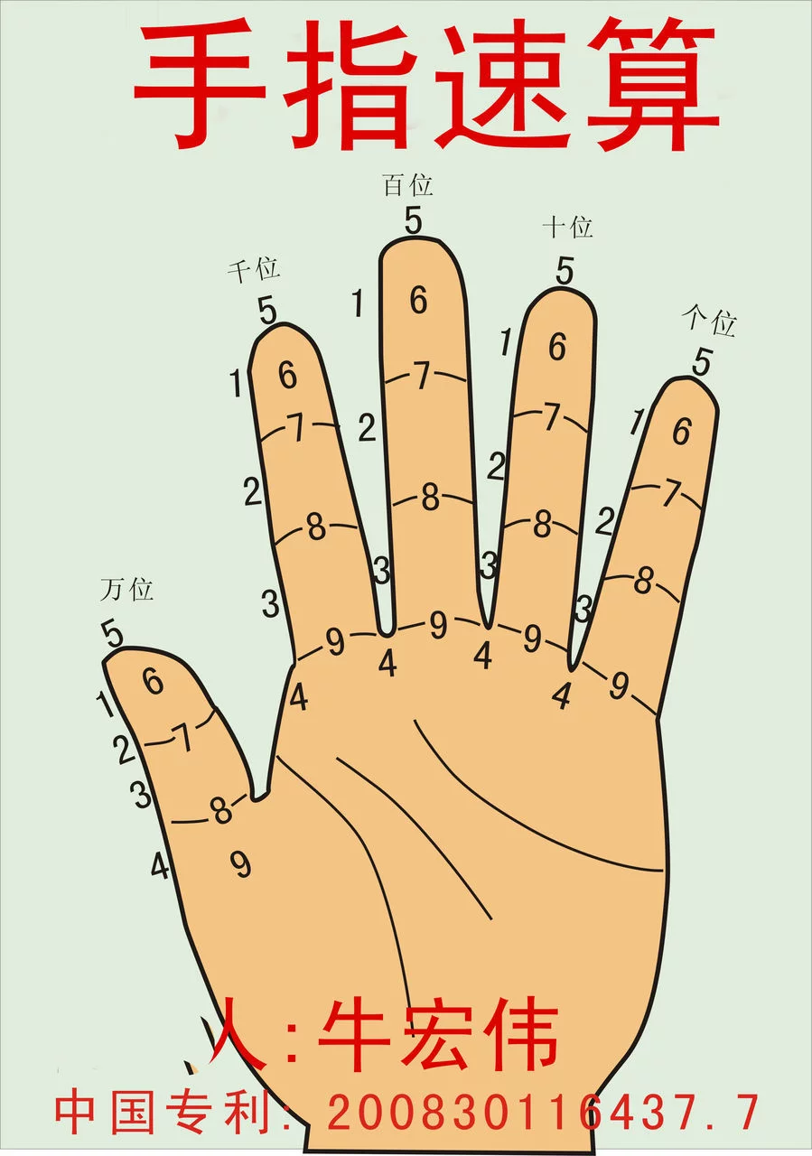 手指速算法是由西安的牛宏伟老师研发的一种速算方法,是一种不用算盘进行数学运算的方法。
