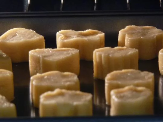 8.酥皮和菠萝陷按比例1:1揉成圆球,酥皮放在手上按扁按薄,放进菠萝陷,慢慢抱紧口(有点像我妈妈其究矛做玉米菜团子的那种,因为酥皮和玉米一样容易碎)放进模具里做成自己喜欢的形状(其实方型的做容易了,推荐织钢盟浓)