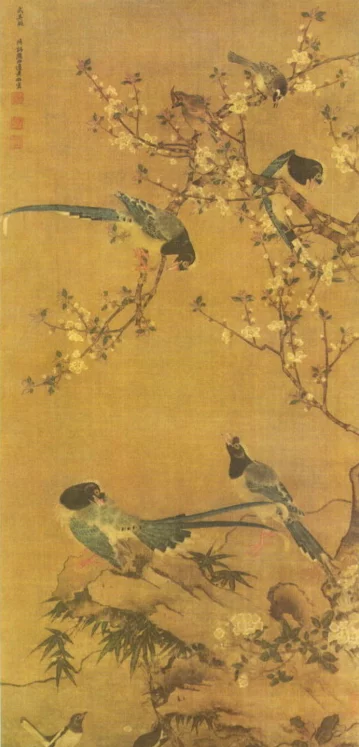 来自边景昭, 生卒年不详,明代画家。字文进,沙县(今属福建)人。成祖永乐(1403-1424)间任武英殿待诏, 为宫廷作画。宣宗宣德(1426-1435)360百科时尚在。博学能诗,擅画禽鸟、花果,师南宋画院体格。设色沉 着而妍丽,一图之中能描绘多种禽鸟。与吕纪齐名,为明代早期线花鸟画高手。传世作品有《三友百禽图》、《双鹤图》、《春禽花木图》。