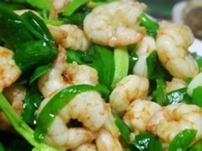 鲜虾烩韭菜,菜品,原料有取鲜虾250g,鲜嫩韭菜100g,精制植物油、黄酒、酱油、生姜丝、醋各适量。