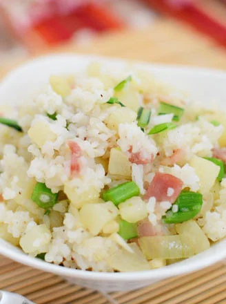 米来自饭1碗、培根3片、土豆2个、油菜心6~7根、洋葱半个、色拉油适量、食盐适量、鸡精适量、大蒜适量、小葱适量、黑胡椒适量