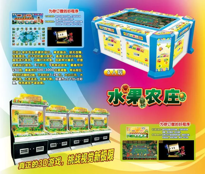 水果农庄游戏机是利用8门押注,5种滚动倍率,最高可中240倍,500-3000任意调整,幸运座位,不定时送翻倍功能,不定时送1-24灯,大小三元,大小彩金,大奖连连,惊喜不断。