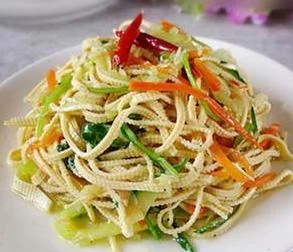 2 困战把豆腐皮用开水泡软,取出挤净浮水,切成丝放碗内;