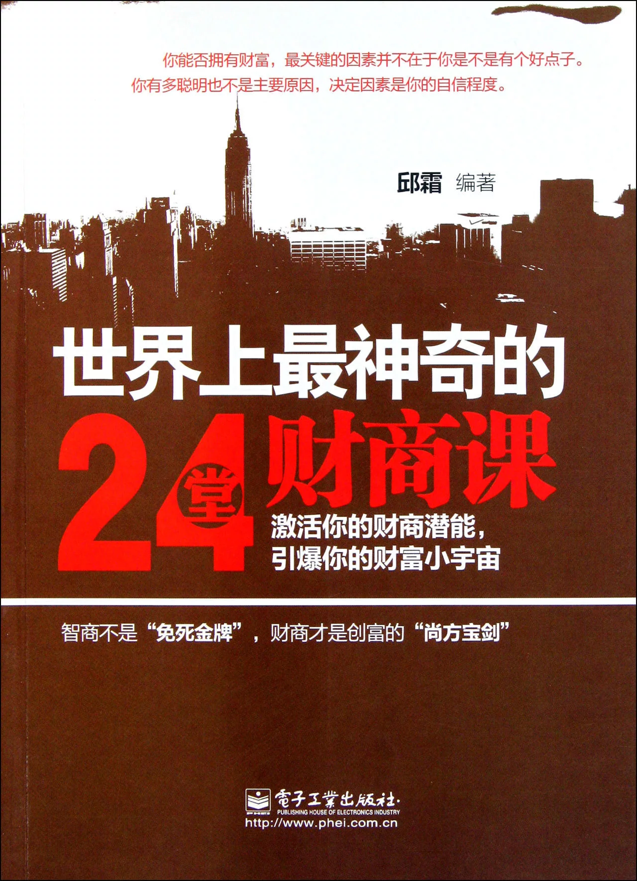 2012年电子工业出版社出版的图书,作者是邱霜。本书通过对财商的分析与阐释揭开财富密码,对财商有深入的了解,清楚自己的财商优势,提高财商,以及更熟练地运用财商创造自己想要的幸福生活!