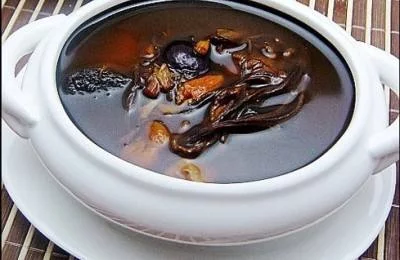 2.把炒锅置武火上烧热,加入素油,烧六成熟时,加入姜、葱爆香,下入猪瘦肉、竹笋、香菇、盐、何首乌粉,加入上汤400毫升,用文火堡20分钟,加菜胆,来自再堡5分钟即成。