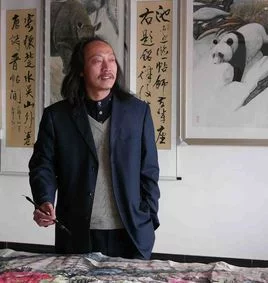 现年46岁的他,看上去比实际年龄略大,我想这也许是他苦修艺术的结果。你如果即兴要求他书写古人的某篇诗词歌赋,他略加思索便信手掂来。我常常想唐代大诗人杜甫"读书破万卷,下笔如有神"的名句是最适合他的。我记得艺术家冯骥才在一篇访谈里曾经谈到各种艺术之间的互补性,大意是说诗词文章里的某个精彩的片段,那种意味用绘画的语言表达出来,就成为一幅独一无二的可以称作是创造性的作品。他对此抱有同感。他说你如果对行、草、隶、篆、甲古等字不熟,不能容纳于胸中,你就不可能在书写整篇诗词歌赋的时候笔如行云流水,你如果不能理解诗词歌赋中的精彩片段,你也不可能把这精彩融入书法阴阳开合的变化之中。只有理解了古人作品的背景,古人的生平和遭遇,才可以用书法更贴近地展现古人胸怀。绘画也是如此,中国画是以线条表现笔墨的关系,中国的许多画家书法不行,那是本末倒置,急功近利的结果。一幅成功的作品,只所以耐看,那是一个书画家用他的书法功底一笔一笔写出来的,你可以从整个画面里看出一撇一捺一顿一折的精彩。大写意画和草书是绘画与书法的两个最高境界,如果我们不排除极个别自称为天才的书画家故弄玄虚,只有融"笔墨"于心中,化感悟于胸怀,那么才可以用笔如神,所绘所写之作品才可以载于自己的思想,所以说,只有将自己所使用的笔与我合为一体的时候,才可以达到功夫不自欺欺人,作品流芳百世。