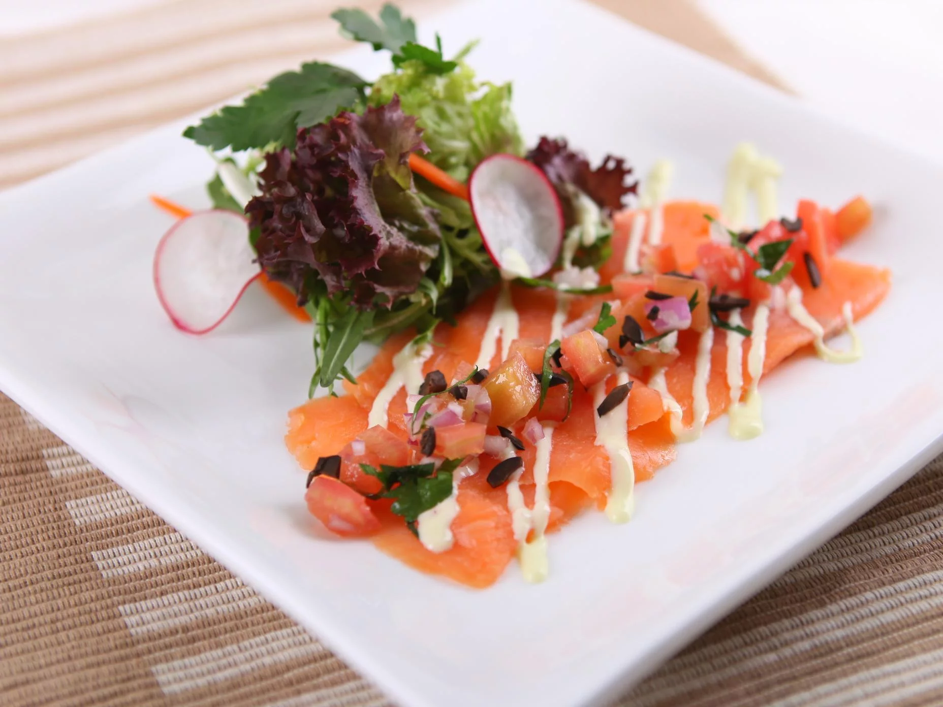 烟熏来自三文鱼沙拉是360百科一道美食,制作原料主要有烟熏三文鱼切片(可换成大虾)、橙子列封沿次、生菜、嫩黄瓜、小蕃茄。