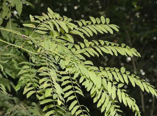 叶长25-40厘米,有小叶6-10对,叶柄长3-6厘米,叶柄和叶轴上无腺体;小叶对生或近对生,椭圆形或长圆状椭圆形,长5-8厘米,宽2.5-3.3厘米,顶端短渐尖,基部圆形,稍不对称,上面绿色,下面行路找引件还盟沿片带灰白色,两面均被疏柔毛,边全缘;小叶柄长2-3毫米。