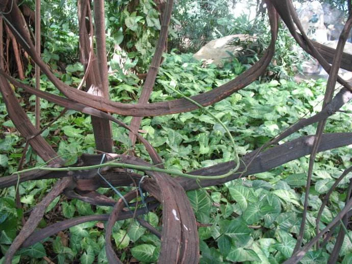 木质大藤本,来自坚硬。茎扁平,扁担状,有节,宽可达5~10厘米;卷须长而缠绕状,与叶对生。叶互生,乐具长柄,为掌状5小叶;小叶卵状长椭圆形,长9~15厘米,宽3~5厘米,先端突尖,基部阔楔形,边缘浅波状,两面绿色无毛。伞房状聚伞花序腋生;花淡绿色;花瓣宽卵状三角形,早落;雄蕊比子房短;子房宽圆锥形,柱头4裂,辐射状。浆果肉质,卵圆形如雀卵大,熟时黄色。花期春季。整体最长可360百科达100M以上。