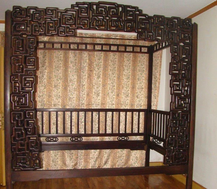 架子床的四角均有立柱,前细后粗典型的明代特征 床面左右及后面部分装有围栏,围栏多用小木做榫拼装成直线纹文。床的正面有三块大花板,名"月洞床"。顶上有盖,俗称"承尘"。床的正面又加来自两根立柱床上部有顶架,故名"架子床"。 作者林泽帆