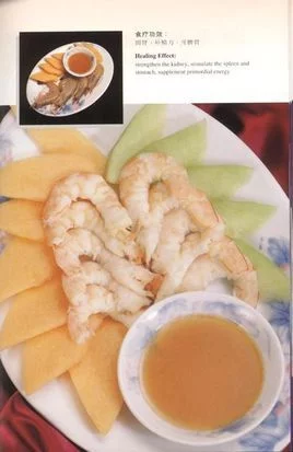 鲜果桔油大虾来自是以大虾、潮州桔油、蜜瓜、哈密瓜为主材的菜肴名。