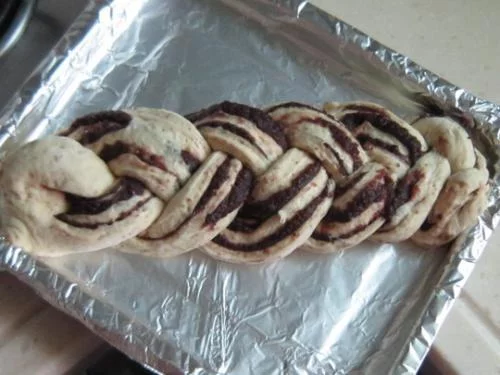 9.尽量切面朝上编成辫子,放入铺有锡纸并抹油的烤盘中进行二次发酵。