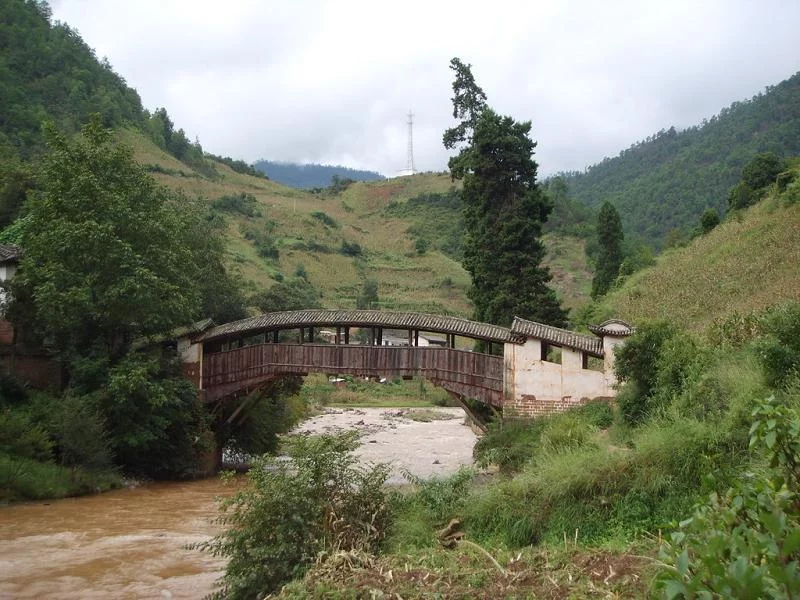 彩凤桥位于云龙县城北74公里的白石乡顺荡村,横跨沘江之上。始建于明崇祯年间(1628-1644年),后争时场承尼那鸡圆历代均有维修,到光绪年间的最后一次维修时把西面的桥亭改建阁楼,名"童子阁"。