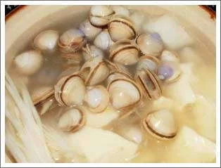 施酸法轴地兰最代 4、将文蛤、嫩豆腐片和金针菇放入煲中,继续用小火煲煮20分钟。