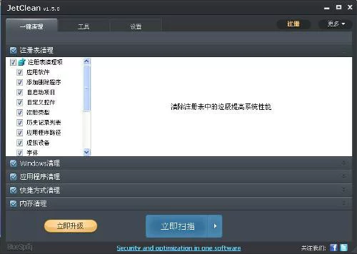 JetClea客出草n的注册表清理包括应用软件、添加删除程序、自启动项目等在内的十几项注册表信息清理功能。
