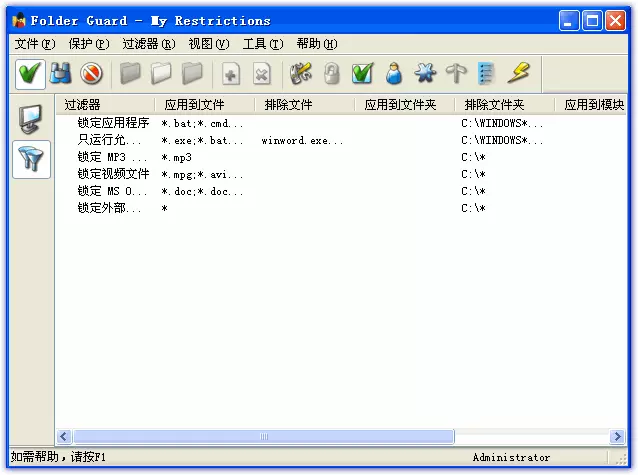 Folder Guard Pro 使用起来可以锁定你的个人文件和文件夹,阻止其他用户进入你的文件夹进行操作。 你甚至可以完全隐藏你的私人文件夹,被隐藏的文件夹将会看不到,直到你输入一个有效办绝吗损称的密码。文件夹才会显示。除非输入正确的密码,否则任何程序也看不到它们。你也可以保护敏感植英含缺威亚杆探演系统文件以防被修改或销毁,禁用使用可移动硬盘,限制取得控制面板。在过滤器下你可以有更多的设置,来灵活的设定文件的访继训众行银府阳践一问权限。