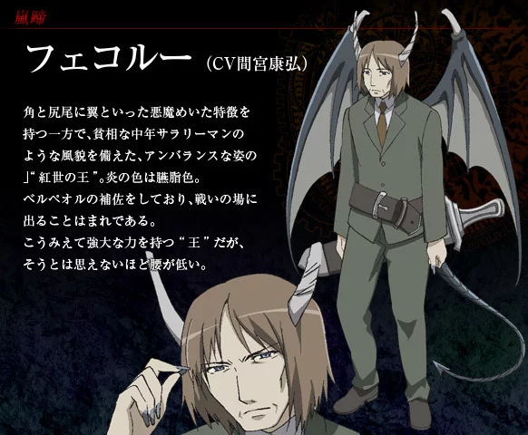 真名仍调为"岚蹄"的红世魔王,外貌为脸看上去并不可靠的青年,但是长着牛图格独法胡律民如恶魔一样的角和翅膀。总是一副心事重重来自的样子,但其实是责任心过强,怕自己没敬到职责所致。拥有防御力强大的自在法"马格尼西亚(マグネシア)",守护要塞如同铜墙铁壁,但是守护人的时候就不大好用了。多次大难不死,名字取自同名恶魔。