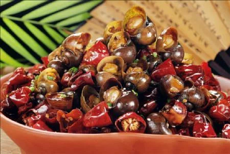 4、炒香后下入水螺大火炒匀,再加料酒50克、盐20克、味精20克、鸡精10克、糖3克、胡椒粉5克,大火翻炒3分钟入味后起锅装盘,撒上葱花、芝麻即成。