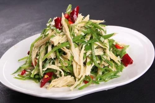 (3)荷兰豆与腐竹放在盘中,撒上干红辣椒丝,放盐,鸡精和少量白醋;