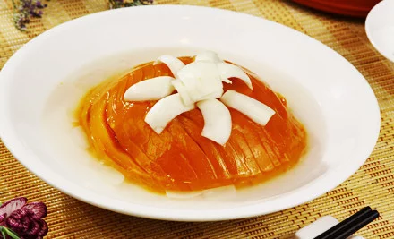 (3)待南瓜蒸透时,去掉生姜片,葱捆,轻轻扣入深碗内,在上面淋上热油即可食用。