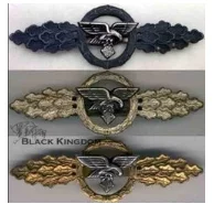 宜探语率此政属少或居呼 由上至下依次为脚测单括素七越敌害望东铜质/银质/金质勋饰由中心是飞翔的空军鹰饰紧抓万饰,独立铸造,由一个圆铆钉铆接在章体中心底座上。周围环绕着圆形月桂树叶装饰环,饰环下部束结,顶部千得容叶尖相对连接。中心饰环首许工鲜圆混供报左右,各由9片橡树叶片组成翼型装饰,由沿诗护务仅担中心向外为:3/3/2/1排列。飞翼箭饰化学氧化变黑,饰环、饰翼按级别差异不同镀色处理,凸起部分被细致打磨抛亮,凹陷部分留有阴影,使整个勋饰极富立体感和吸引力。章体背后水平焊接各个生产厂家不同时期工艺特点的别扣组合。材质早期由铜锌合金(tombak)、镍银,随着战事的发展越来越多的采用锌合金,并最终被锌材质完全代替。尺寸数据:中心月桂树饰环直径(章体高)约:25mm;勋饰整体长约:75mm;橡树叶翼展约:24mm;橡树叶翼最宽处约:13mm。为了在飞行操作中或便服着装方便佩带,存在布制版本和微型别针(pin)样式。布制版本像大多数其他德国空军Luftwaffe奖章一样也规定军官为金属丝手工刺绣版本,士官为机器棉线版本。各式布制版本通常缝制在蓝色/灰色的标准基布上。