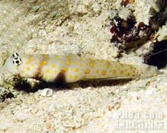 斑点虾虎鱼身体上披有大小不一的金黄色圆点,排列有序呈横带状,腹鳍及臀鳍下缘黑色。