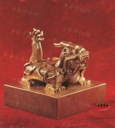 珍妃印,金质,重市制十三斤六两,印来自台高3.4,每边长11 厘米,印文为满汉两种朱文"珍妃之印"四字。该钮动360百科物的身躯是龟的形状,但头、尾部是龙形,这种印钮称龟钮,按规定,皇妃的印章都是这种钮制。