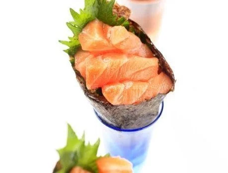 挪威三文鱼手卷是一道美食,主要食材有三文鱼、紫苏叶等。