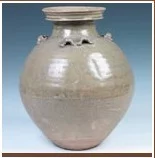 盘口,短颈,鼓腹害训,平底。肩部附饰六系。釉色青中泛黄,不到底。底部露砖红色胎,并有明显的泥点垫烧痕。