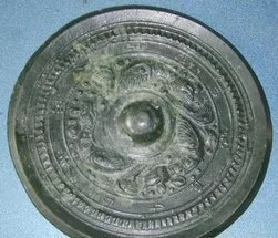 汉龙虎镜,圆形,圆钮,钮外饰有龙虎相峙,下饰独角兽一,其外围以绳纹及弦纹。