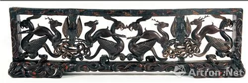 战国雕刻查都重球资下基。湖北江陵望山1号楚墓出土。透雕,高15厘米,长51.8厘米,上宽3厘米,下宽12厘米,外框由盘绕的蟒蛇组成,共雕有五十一个动物,计大蟒二十条,小蛇十七条,蛙二只,鹿、凤、雀各四只,髹黑漆底,以朱红、灰绿、金银漆彩绘凤纹等,真实表现各类动物角斗的情景,组成左右对称、装饰性很强的效果。