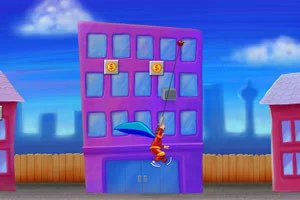 发射弹力枪吸附住墙壁,把超人甩出去,越高越远得分越多。