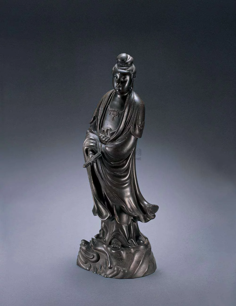 铜嵌银观音立像是明代文物,为明代石叟铜雕中之精品。