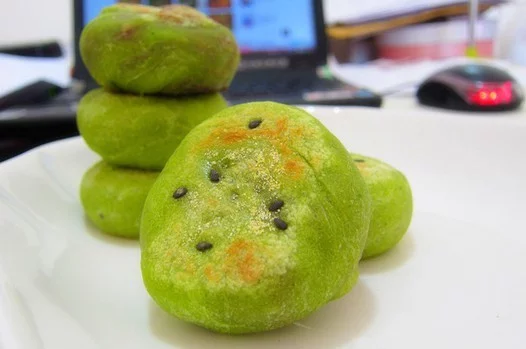 2.糯米粉来自中加入菠菜汁调匀,觉得比较干我就加了牛奶调至软硬适中的面团,不沾手。