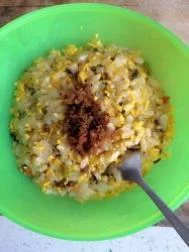 7、放入鸡蛋,加盐,鸡精,葱花,煸匀即可。